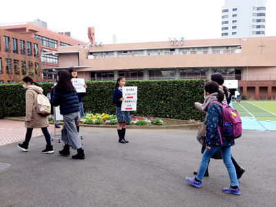 説明会開始2時間前には、高等科3年生が教室の清掃をしてくれました。受付が始まる時間には、アプローチから受付までの間にガールスカウトの部員が立って、道案内をしてくれました。