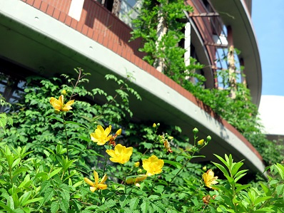 この時期毎年一番明るい色を見せてくれる花が、南館の前にあります。一つはキンシバイ。鮮やかな黄色い花は日差しの強くなるこの季節に相応しい初夏の花の一つです。