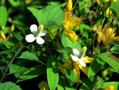 また、そのすぐ近くに咲いているのがビヨウヤナギです。キンシバイとほぼ同時期に開花するこの花も、やはり鮮やかな黄色が見事です。