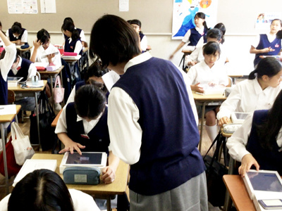 iPadを手にした中等科1年の生徒達は、うれしそうに設定を進めました。操作に慣れない生徒には、高2、高1のICT委員の生徒が丁寧にサポートしました。