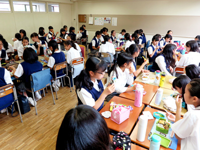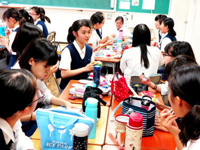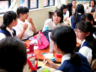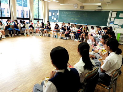 6月28日に行われたランチトークは、4時間目終了後に高等科3年生のBIG SISTERが自分のお弁当を持って中等科1年生の教室を訪れ、あるクラスではお弁当を食べている各グループにそれぞれ入って、またあるクラスではクラス全員が円になって座ったその円のところどころにそれぞれ入って、一緒にお弁当を食べながらお話をするという形で行われました。