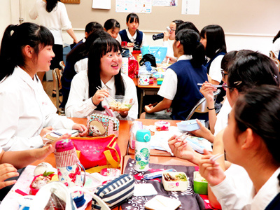 普段、朝の礼拝前や終礼・掃除などに出かけている教室であるにもかかわらず、いつもと勝手がちがうので少し緊張して中等科1年生の教室に入ったBIG SISTERたちでしたが、すぐに話もはずみ、BIG SISTERに積極的に質問をする中等科1年生がいたりして、お互い打ち解けて食事を楽しんでいました。