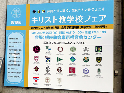 既報の通り、7月29日(土)に銀座教会 東京福音会センターに於いて、「第18回キリスト教学校フェア」が開催されます。東京都内のキリスト教学校(中学校・高等学校)20校が集まって、学校の紹介をします。生徒による学校紹介や音楽の演奏なども行われます。