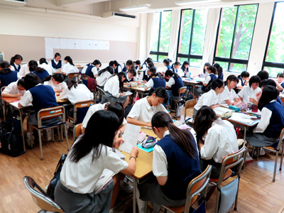 夏休みに入り、毎年恒例の夏期学習会が7月19日より始まりました。例年通り高等科の学習会は先生による講習が行われていますが、今年も中等科の学習会は、英語と数学の二教科各75分、課題を与えられながら自学自習をする学びの時間として設定され、同時期にクラスごとの山荘生活が行われる中等科1年生を除いた中等科2・3年生が各教室で取り組んでいます。