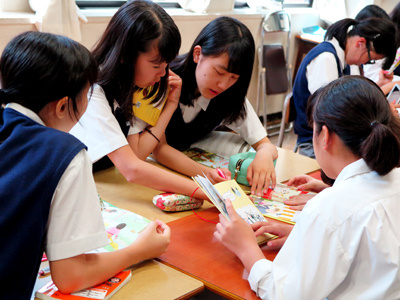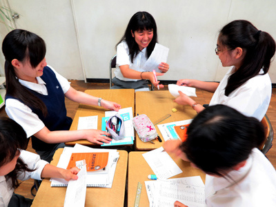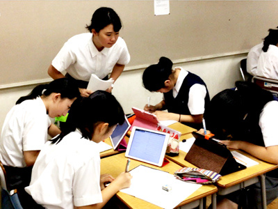中等科の生徒たちも、先生に対するよりもむしろ良い意味で緊張をし、また憧れの上級生に見てもらっているのが嬉しそうで、教室内には清々しい空気が流れています。75分の時間が終わる時には、高等科3年生が明日の学習に向けての課題を提示したり、心構えを話したりする姿もあり、高等科3年生の生徒たちにとっても、良い学習の場となっています。
