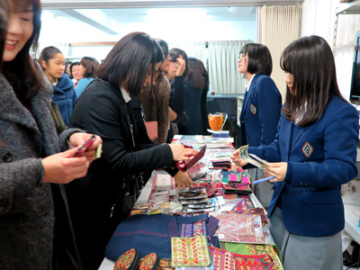 また、一学期の第1回宗教講話で「パレスチナ子どものキャンペーン」事務局長の田中好子さんによる「パレスチナとシリア難民の子どもたち 現状と支援」というお話をうかがって、パレスチナの子どもたちの現状を知らされ、8月に自ら田中好子さんの事務所を訪れ、田中さんたちがパレスチナの女性や子どもたちの支援を行っているお話をうかがい、そこでパレスチナ刺繍に出会ったこと、高校生の私たちでもできる支援の活動としてパレスチナの刺繍品を校内で販売しようと考えたこと、それが私の使命なのではないかと考えたことなどを、祝会に参加した方々に向けて真剣に話してくれました。会場の皆様はその真摯な話に、うなずきながら耳を傾けてくださり、すぐに販売されている製品のもとに多数の方が訪れてくださいました。