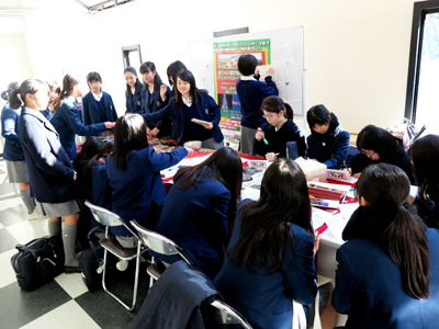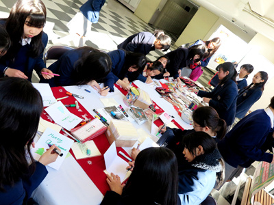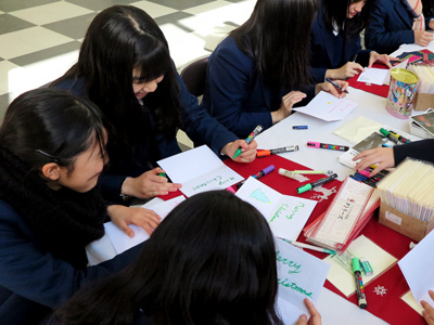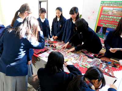 12月4日からパレスチナ刺繍などの販売を始めたことは既にこのホームページでもご報告しましたが、12日のメッセージの中で「さらにこのパレスチナのカードを使って東日本大震災被災地の方々へのカード送付に加えてほしい、そのためにカードを書く場所を筆記用具とともに売場の脇に設置するので是非来て買って書いてほしい。」とアピールしていたように、同日昼からこのコーナーが置かれ、多くの生徒が集まってきていました。皆この売場でカードを購入し、その脇のコーナーで一生懸命工夫して被災地の方々へのクリスマス・メッセージを書いていました。