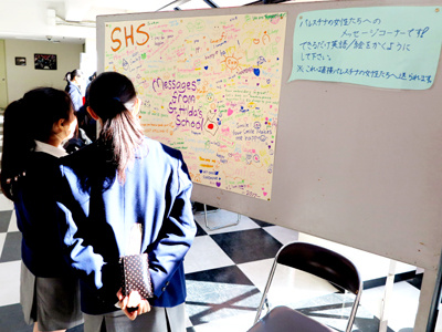 また、4日から用意されていた「パレスチナの女性たちへのメッセージコーナーです! ~できるだけ英語/絵をかくようにしてください。 ※これは直接パレスチナの女性たちへ送られます。」という大きな模造紙が張られたコーナーも、既に生徒たちが思い思いに綴ったメッセージでぎっしり埋まっていました。