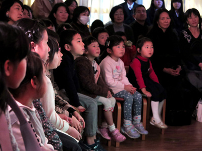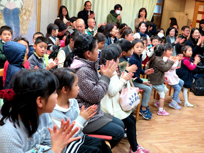 超満員の会場でステパノ会の子どもたちは、目を光らせて食い入るように劇を鑑賞していました。そして劇が終わったら、元気よく拍手を送っていました。人形劇部の部員たちも精一杯頑張って素晴らしい公演をして、それぞれ自己紹介をする時も満足の表情でした。会場から帰る時に子どもたちが、人形劇部員の持つ人形たちを触りながら帰って行ったのが印象的でした。
