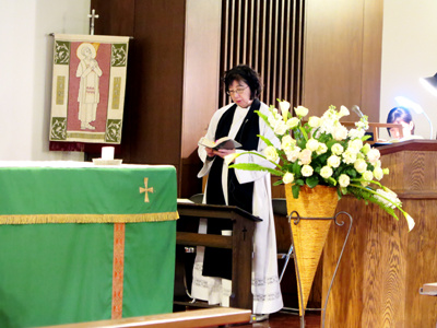 三光教会の神崎和子司祭の司式で始まった礼拝は、高等科2年の奉仕生徒による第一日課の旧約聖書朗読「創世記」第32章23節~33章17節、第二日課の新約聖書朗読「マルコによる福音書」第12章28節~34節、そして同じく高等科2年の奉仕生徒のオルガン伴奏による聖歌(34番、341番)など、今回も生徒が礼拝奉仕に積極的に参加する形で進められました。