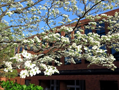 アプローチの先、管理棟の受付入口脇にはハナミズキの白い花が見事に開花しました。