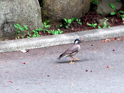 アプローチの桜(ソメイヨシノ)も実(サクランボ)がたくさん付いて、それらが下に次々と落ちているのを啄ばみに来たのかムクドリたちがアプローチを歩いています。