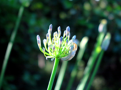 アプローチ途中の右側にこの季節咲く華やかな草花がアガパンサスです。水色の芸術的な姿を見せ始めています。