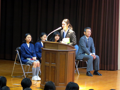 実習初日の11月5日の朝の全校礼拝の中で全校生徒に実習生が紹介され、引き続き実習生が挨拶をしました。