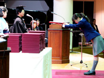 オルター・ギルドの生徒によって祭壇のロウソクに灯が点され、聖歌403番とともにアコライト・ギルドの生徒たちの先導によるプロセッションが入堂して高橋チャプレンの司式によって厳粛に始まった感謝礼拝。聖書は青野教頭により「コリントの信徒への手紙 1」(第12章4節から)が朗読されました。クワイヤーによるアンセム「Laudate Pueri」(F. Mendelssohn)、青野教頭の学事報告に続き卒業証書授与が行われ、一人一人の卒業生は自分の名が呼ばれると壇上に上がり高田校長から卒業証書が手渡されました。
