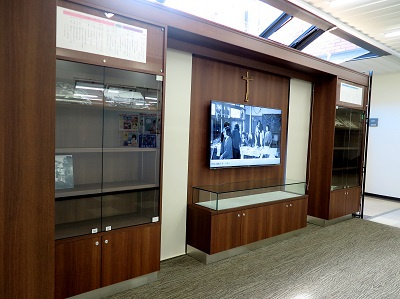 既に学校史資料室Facebookでも何度かにわたりご紹介しておりますが、本館校舎エントランスホールに「香蘭女学校ヒストリーエリア」が作られています。工事自体はこの夏休み中に終了し、今はソフト面の展示を調えつつある段階です。