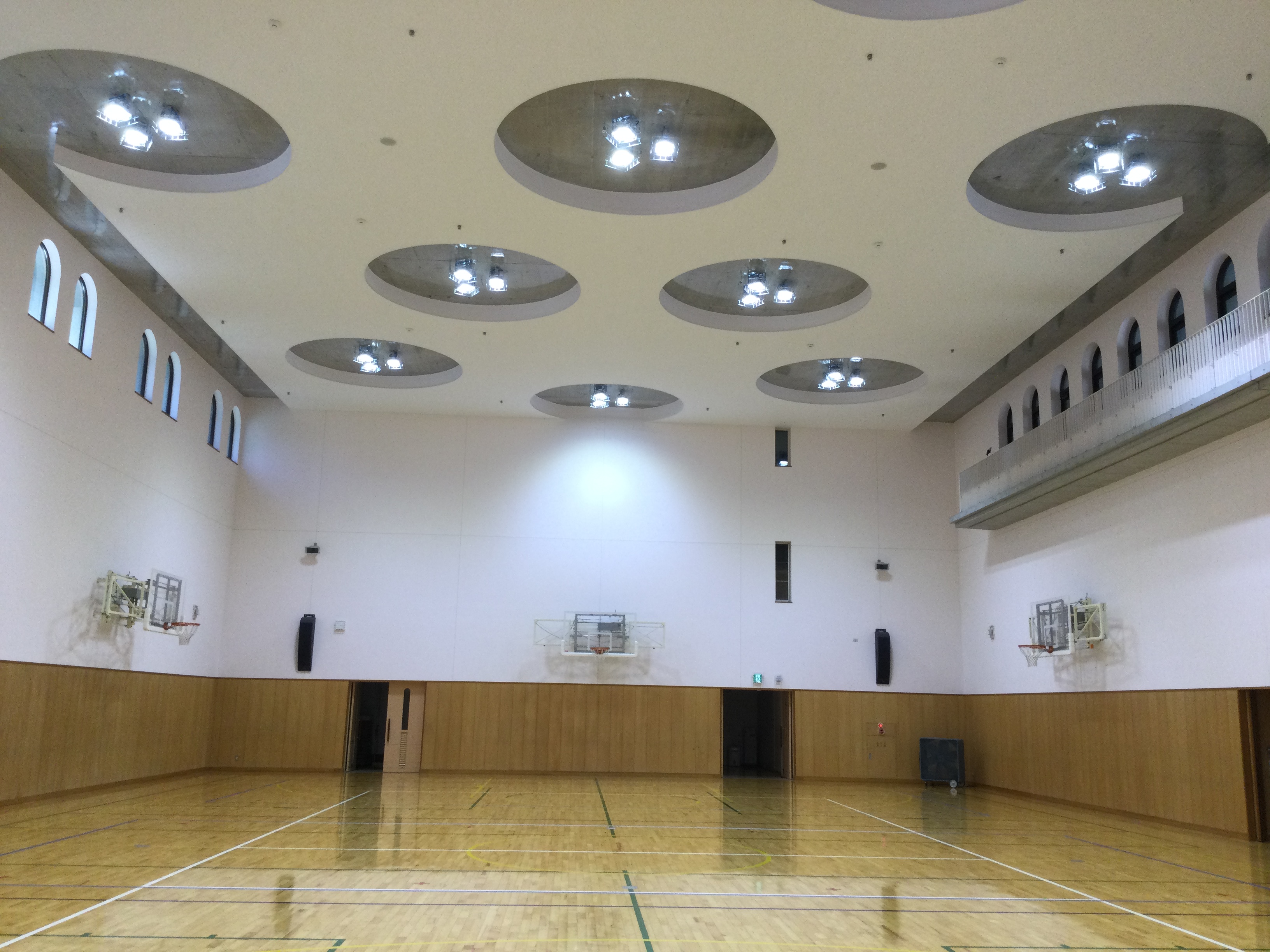 従来アリーナは水銀灯、タナ―ホールはハロゲン灯を利用していましたが LEDへの更新を行いました。これにより大幅な消費電力、CO₂の削減が見込めるようになりました。