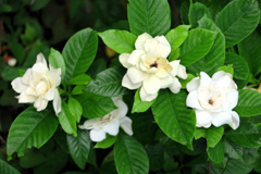 築山を歩いてゆくと、一番奥の体育館棟西側にヤエクチナシの白い花があちらこちらに見受けられます。また、さらにその先の石段を上って体育館棟屋上のフローラル・ガーデンに出ると、花壇のハナゾノツクバネウツギ(アベリア)の樹にたくさんの花が咲いています。