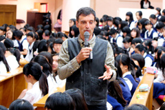 ユーモア溢れる話しぶり、生徒みんなが関心を持ちやすい目の前にある新鮮な話題、中等科1年生にもわかりやすい分析、そして問題に対して鋭く切り込みそれを生徒に訴えかける圧倒されるような熱意。全校生徒はのめりこむように先生の話に聞き入り、時折生徒座席を周りながらマイクを生徒に向けて質問をされる先生に、次々と率直な感想や意見を述べていました。