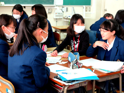 そして今回は、清水台小学校の児童たちが香蘭女学校の英語の授業を受けるという交流が行われました。1月24日の午後、清水台小学校5・6年生14名が来校し、中等科1年D組の英語 Half class の50分の授業を、中1の生徒たちといっしょに受けました。