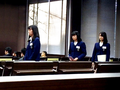 主催者を代表して、國學院大學の赤井益久学長の挨拶や来賓の祝辞に引き続き、表彰状授与が行われ、國學院大學の赤井学長から各受賞者に表彰状が手渡されました。「地域文化研究部門」で受賞した香蘭女学校高等科からは、代表して高等科3年生3名が壇上に上がり、表彰状を受け取りました。