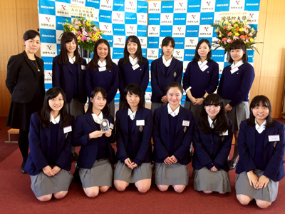 表彰状を受け取り、その後の全体集合写真撮影までを緊張しながら経験した高等科3年の生徒たちでしたが、閉会後に香蘭生だけで記念写真スナップを撮った時にはようやくその緊張もとれて、嬉しい満足いっぱいの笑顔を見せていました。
