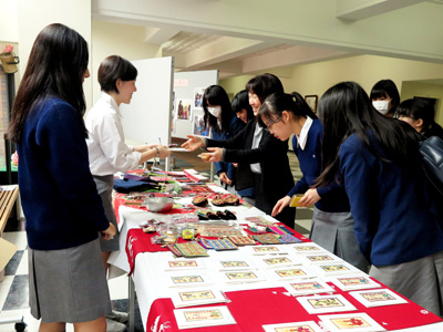 既にご紹介しましたように、12月2日の礼拝の中で全校生徒に呼びかけを行った、自主的に計画をたてて準備してきた高等科2・3年生の有志生徒による、パレスチナの女性や子どもたちを支援する活動が、12月4日の昼から校内のエントランス・ホールで開始されました。