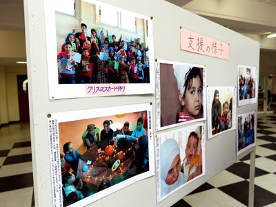一学期の第1回宗教講話で「パレスチナ子どものキャンペーン」事務局長の田中好子さんによる「パレスチナとシリア難民の子どもたち 現状と支援」というお話をうかがって、その後自ら田中好子さんの事務所を訪れ、田中さんたちがパレスチナの女性や子どもたちの支援を行っている話をうかがい、そこでパレスチナ刺繍に出会ったこの生徒たちは、エントランス・ホールにパレスチナ刺繍のリストバンド、クリスマスカード、しおり、ポーチ、バッグなどを並べて販売すると同時に、パレスチナの悲惨な現状、日常生活の様子、伝統衣装、さらにパレスチナ支援の様子などの紹介展示も行いました。