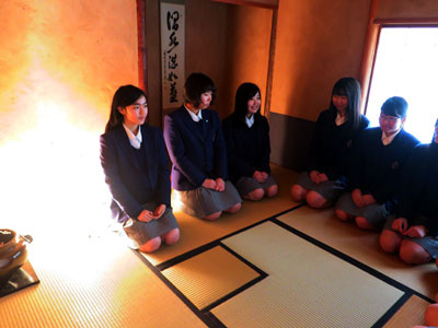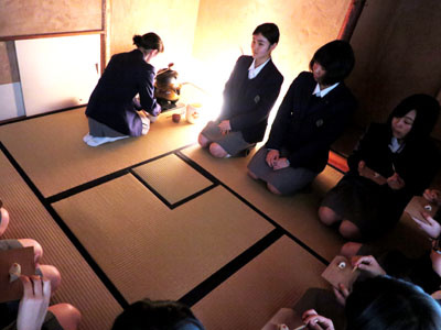 参加した生徒たちは、待合となっているビカステス記念館のサロンで茶道の手順や心得の説明を受けた後しばし休みをとり、それから露地門を通り、腰掛待合の前の茶庭の踏み石の上を歩いて茶室に向かいます。茶室「芝蘭庵」の躙り口から入り、いよいよお点前の接待を受けます。お菓子をいただく時もお茶を一服いただく時も、生徒はとても嬉しそうに、美味しそうにいただき、会話も心なしか普段より緊張しながらも弾み、実に楽しい豊かな時間となっていました。