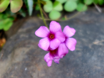 また、アプローチの反対側、途中から築山に入る小道の脇にはイモカタバミの紫色の小さな花が開いています。